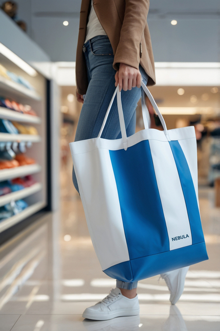 Сумка-пакет Close up of modern, futuristic, large shopping bag in white and blue colors in hand in a bright shop interior.