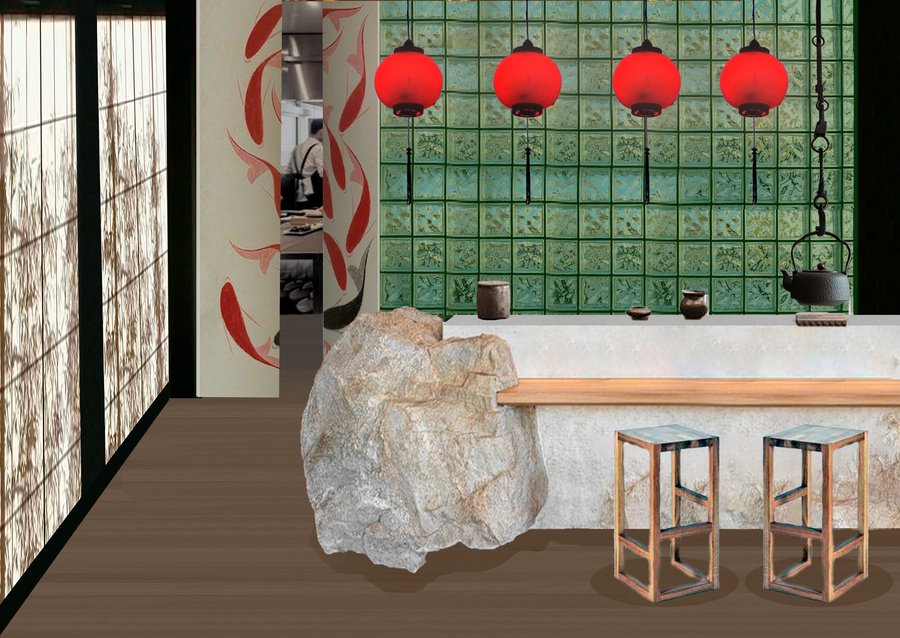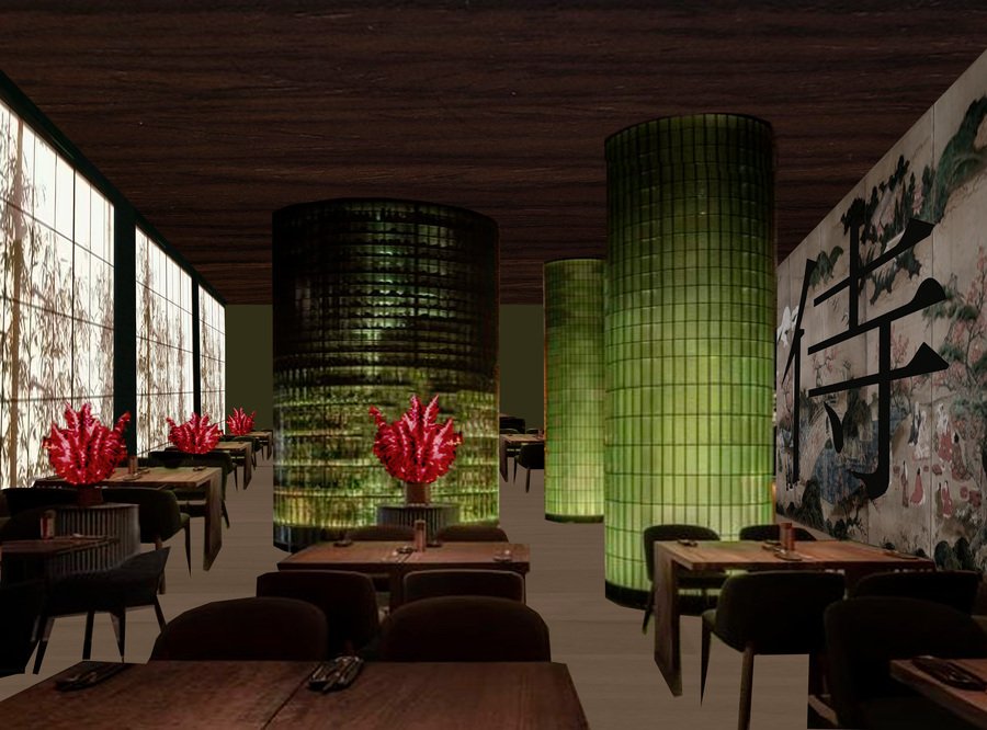 Стиль интерьеров в приглушенных и спокойных тонах, взятый из домов в Киото состоит из традиционных объектов: ламп бомбори (фонариков) ширм, бамбука, кругов, красного цвета. Интерьер в зонах для персонала спроектирован так, чтобы обеспечить сотрудникам комфортные условия для пребывания и работы в данном пространстве на протяжении всего рабочего времени.