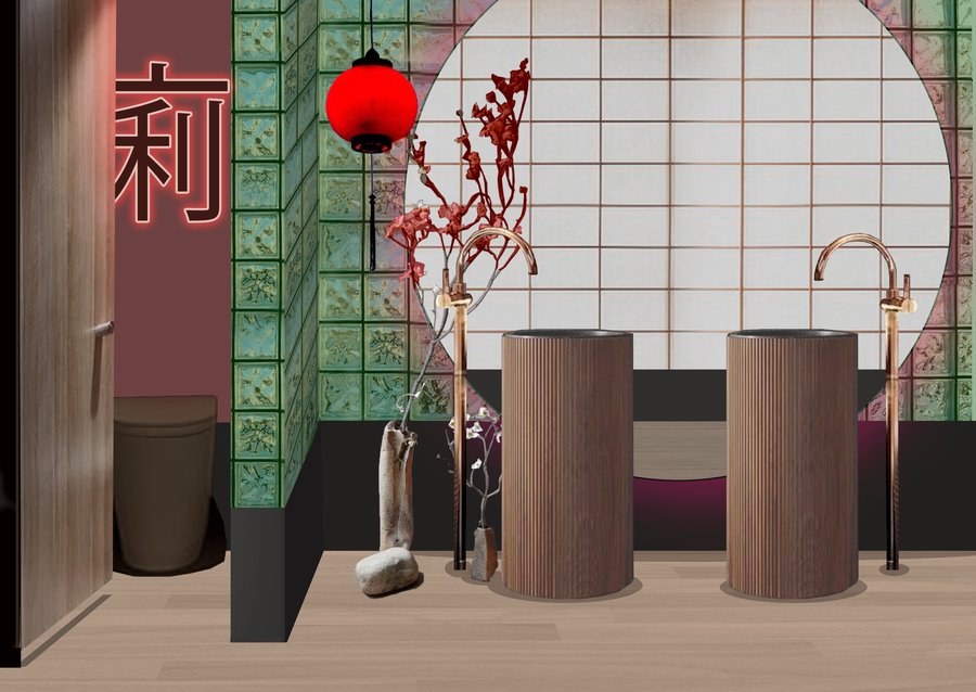 Прототипом стиля к общественным помещениям, для того, чтобы создать запоминающийся декор и интерьер стали популярные места в Киото: (бамбуковый лес, Святилище Фусими Инари, сад камней Рёандзи, храмы Тенрюдзи и Хэйан. Основные цвета, использующиеся в помещениях для общественного доступа (коридор, пандус, ресторан: красный и зеленый, отсылающие к солнцу и природе соответственно.