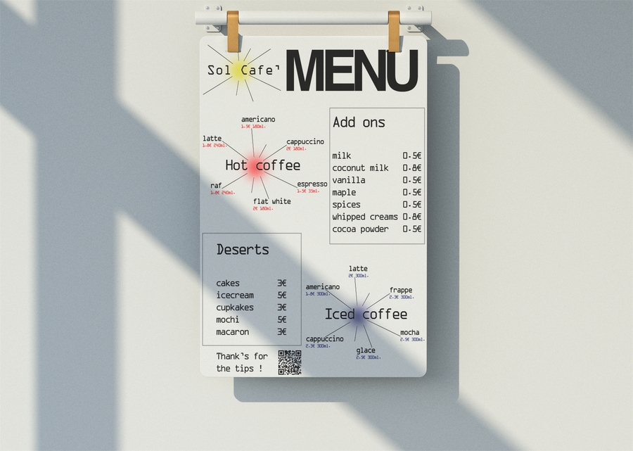 promt for ideogram: photograph of the menu on the wodden table. It is menu for coffeeshop named Sol Cafe. Use minimalistic and futuristic fonts. Add prices for coffee. The paper is white and the text on it black. Use pattern of sun.