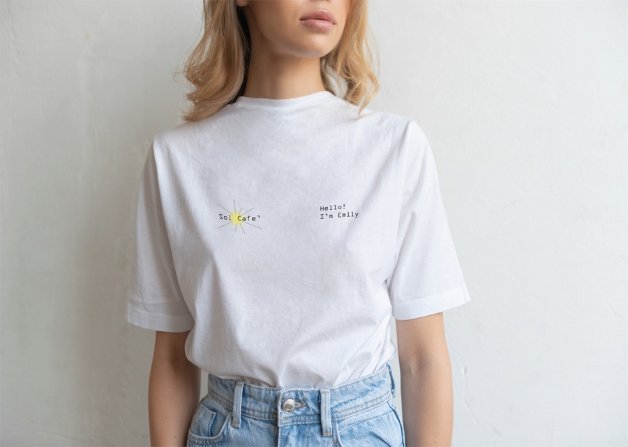 promt for ideogram: Fashion photograph of the standing fulllbody moadel wearing white t-shirt and jeans. On the top of t-shirt written «Sol Cafe — Coffee from sunny Barcelona». All t-shirt painted with circle sun pattern. White background.