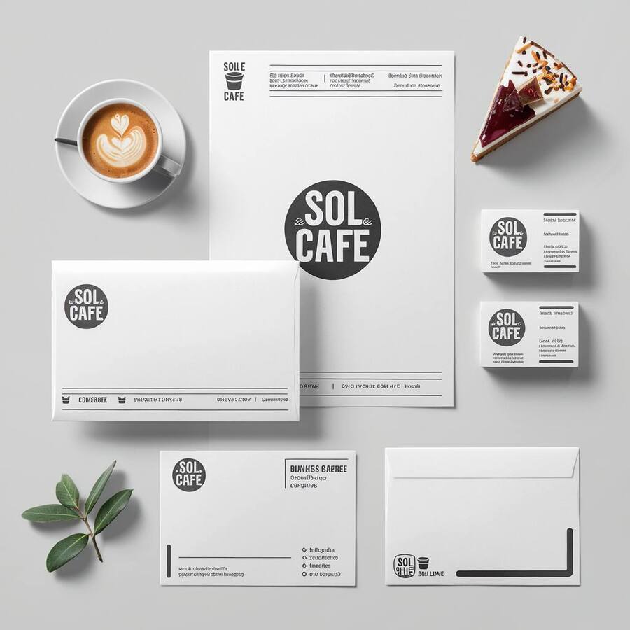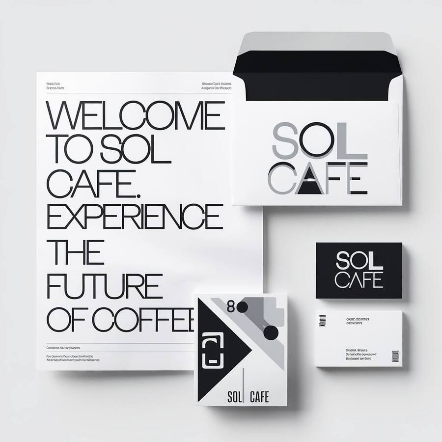 promt for ideogram: generate a mockup of printed materials (paper, envelope, business cards) on a white background for the «Sol Cafe» coffeshop brand in futuristic and minimalistic style using white and black colors