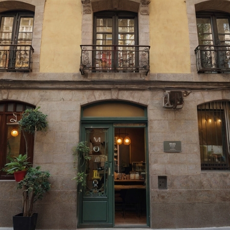 Make a building located in Barcelona. It’s coffeeshop. First floor must be with a big bright windows. The building it’s an old Spain house with four floors.