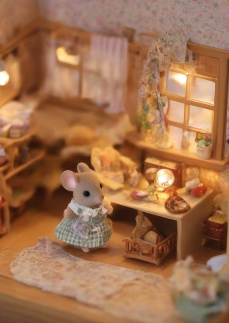 A baby sylvanian families bear is serving tea and jam to his friends at a forest picnic. / A tiny sylvanian families mouse is tidying up her cozy and sweet room, filled with soft warm lighting.