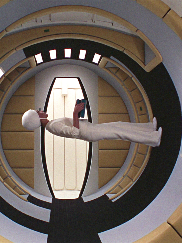 Данные кресла сделаны очень широкими, они говорят о комфорте, также комфорт данных перелётов подчёркивает то, что открывающий кадр этой части фильма показывает одного из героев, спящим (илл. ниже), что демонстрирует обыденность подобного перелёта для людей, живущих в 2001 году Кубрика.