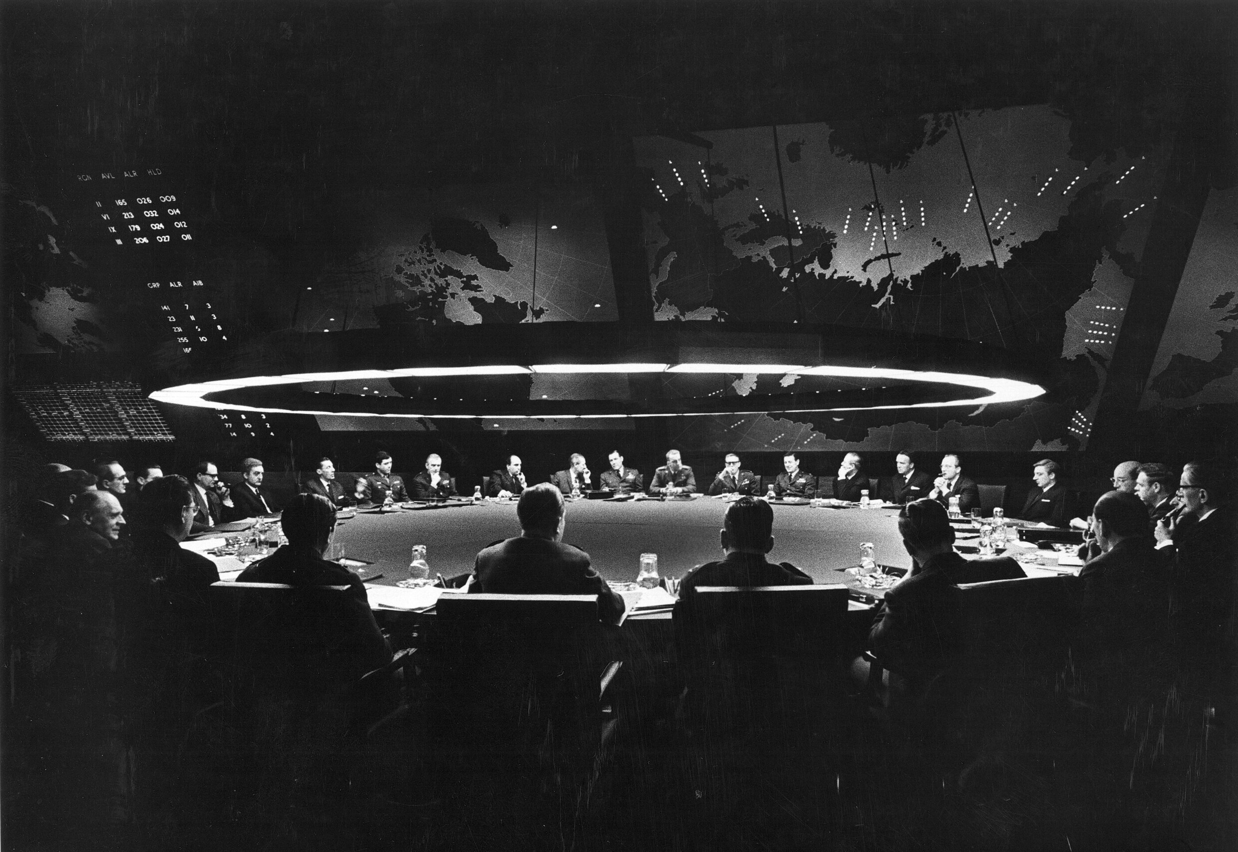 Однако мечтания о далёких мирах за звёздами были в некоторой степени продиктованы тем, что происходило на земле. Помимо космической гонки 60-е характеризует и обострение холодной войны: война во Вьетнаме, «полёт Пауэрса», испытание водородных бомб, «Пражская весна» и Карибский кризис. В 1964 году выходит фильм Стэнли Кубрика «Доктор Стрейнджлав, или Как я перестал бояться и полюбил бомбу», сатирическое высказывание, закрученное вокруг ядерного вопроса. Важно отметить, что фильм Кубрика наиболее ярко передаёт свою анти-военную идею фильма через декорации зала заседаний.