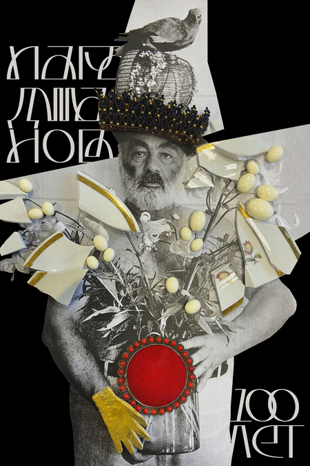 Плакат к 100-летию великого и значимого режиссёра Сергея Параджанова выполнен в технике, которую использовал и сам Параджанов в своих коллажах. Черно-белый снимок дополняется разбитыми кусочками кухонной утвари и рассыпанными бусинами, которые создают ощущение, что композиция получилась совершенно случайно. Будто золотая рука режиссёра несла тарелку с красным гранатом и не удержала её, но не от падения, а от создания шедевра, акта настоящего искусства.