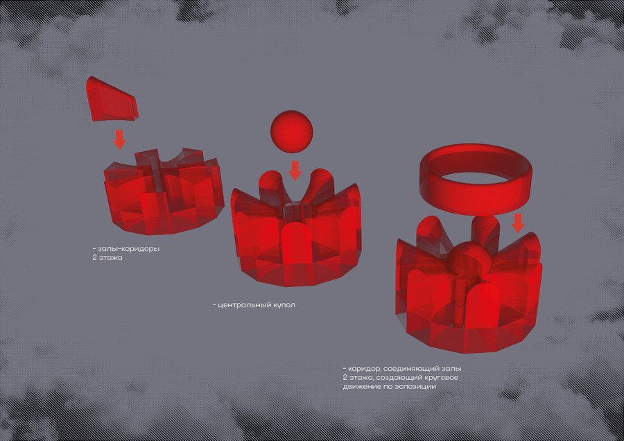 В здании музея посредством смешения контрастных архитектурных решений передаются основные смыслы алхимии, как явления.