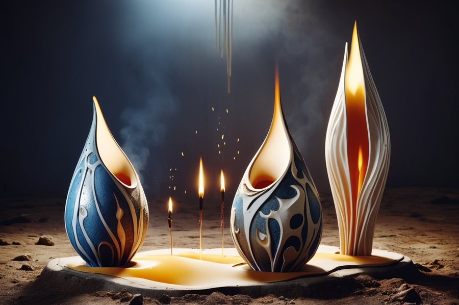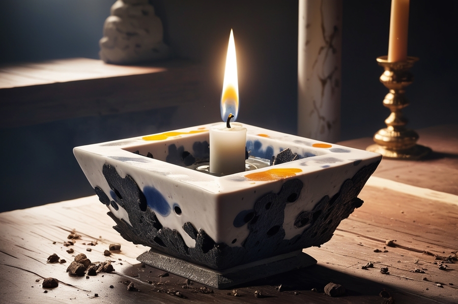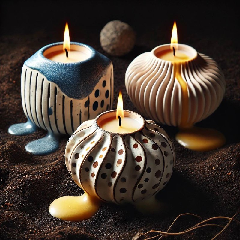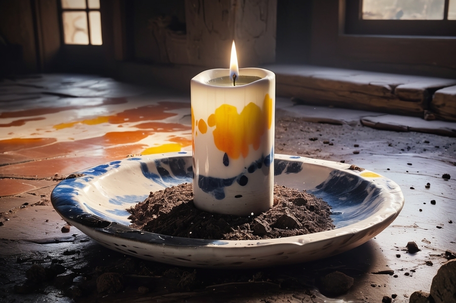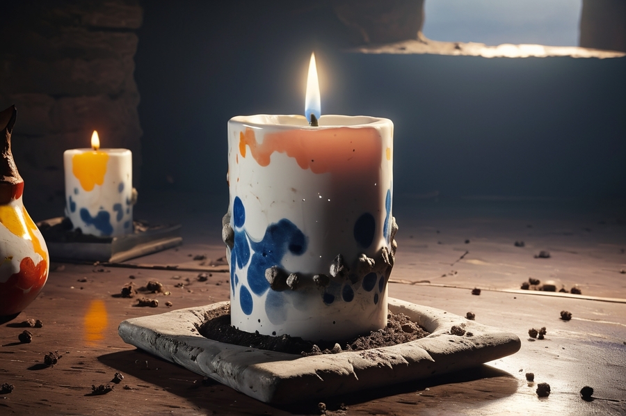 A creamy porcelain candle holder, tilted at a 45-degree angle, casts a warm, mystical glow in a dimly lit, secluded space. Wax spills out like a whispered secret, pooling on dark, ancient earth. The flickering flame dances, conjuring an aura of enchantment and intimacy. Shadows tremble, imbuing the scene with an air of mystery. The creamy color of the candle holder, the play of luminescent light, and the texture of the spilled wax converge to evoke a sense of mystique, transporting the viewer to a realm of quiet, spellbound beauty.