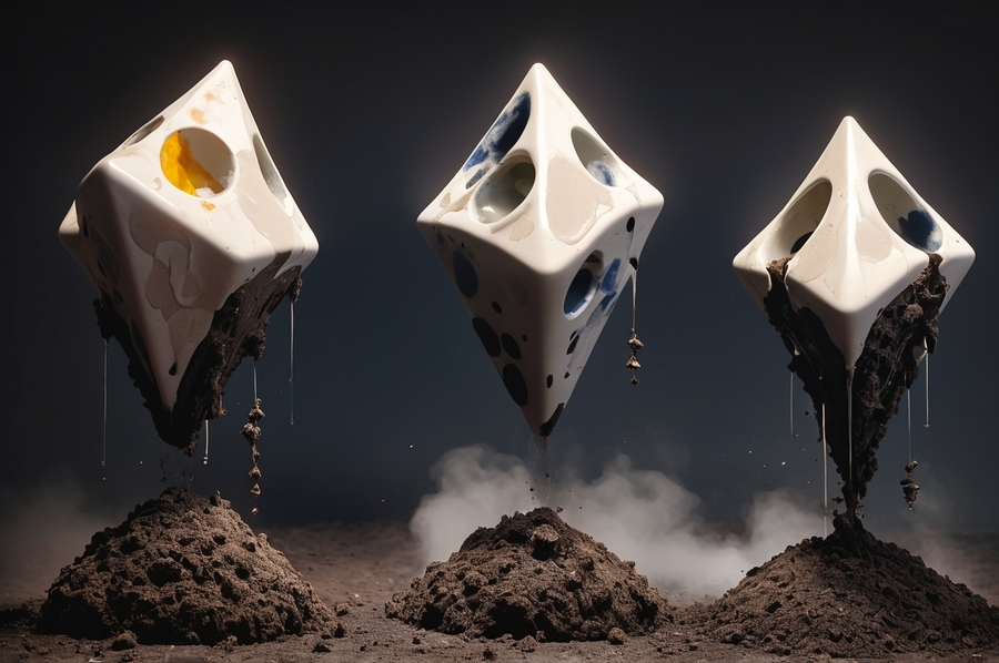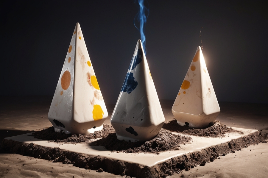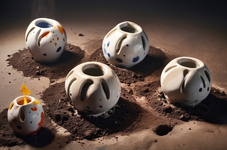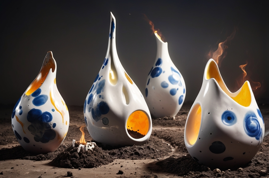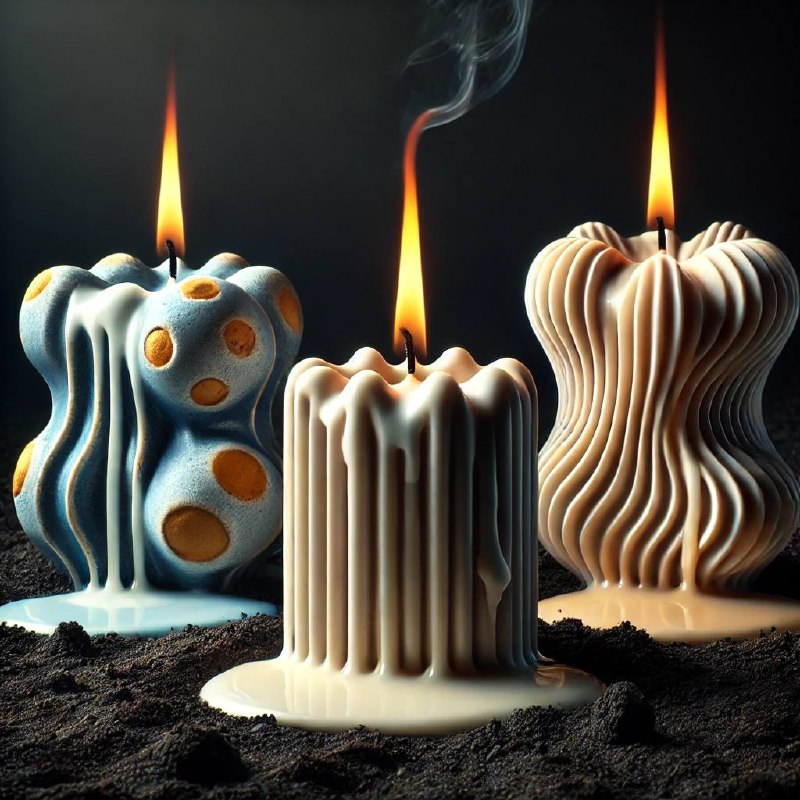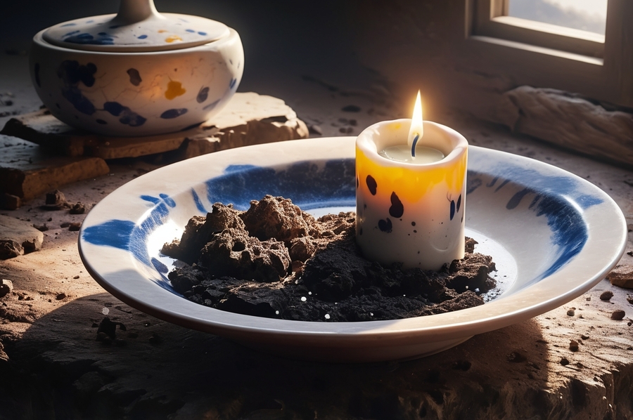 A creamy porcelain candle holder, tilted at a 45-degree angle, casts a warm, mystical glow in a dimly lit, secluded space. Wax spills out like a whispered secret, pooling on dark, ancient earth. The flickering flame dances, conjuring an aura of enchantment and intimacy. Shadows tremble, imbuing the scene with an air of mystery. The creamy color of the candle holder, the play of luminescent light, and the texture of the spilled wax converge to evoke a sense of mystique, transporting the viewer to a realm of quiet, spellbound beauty.