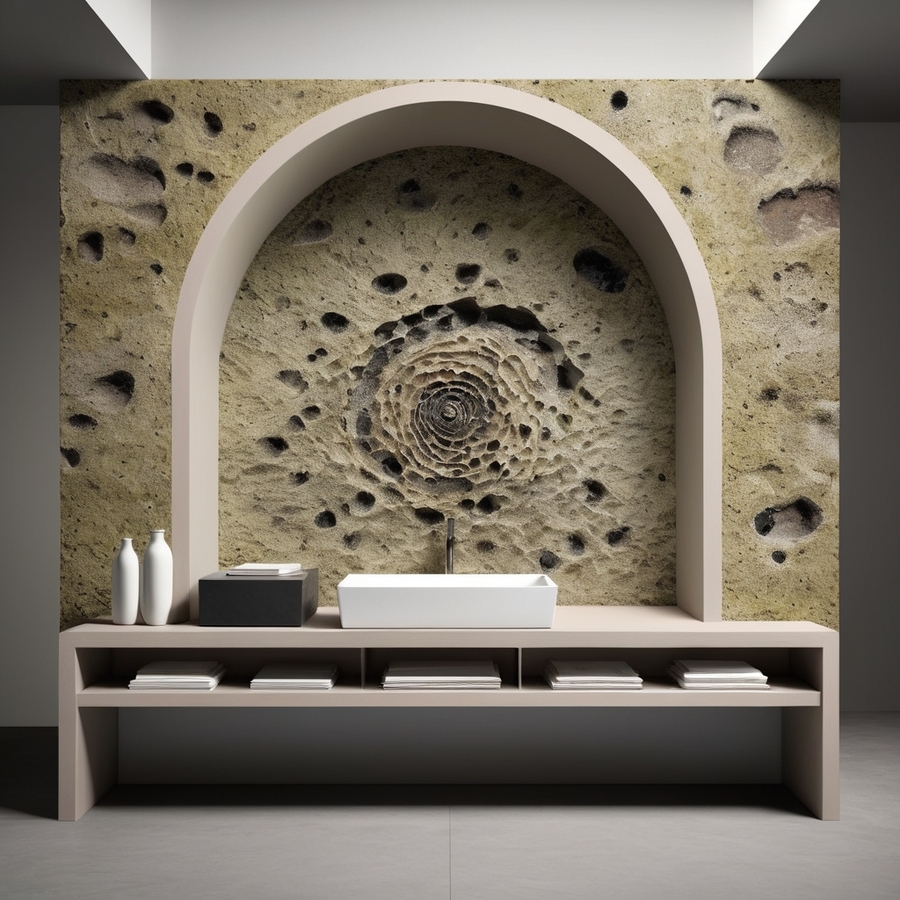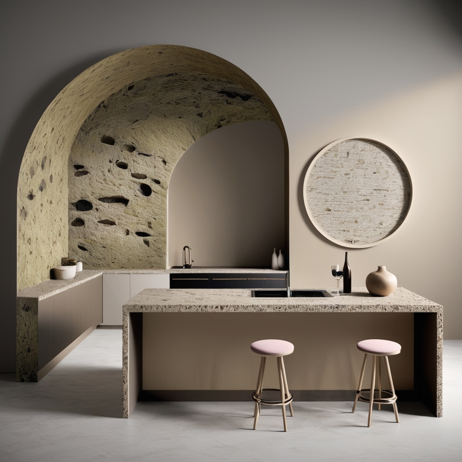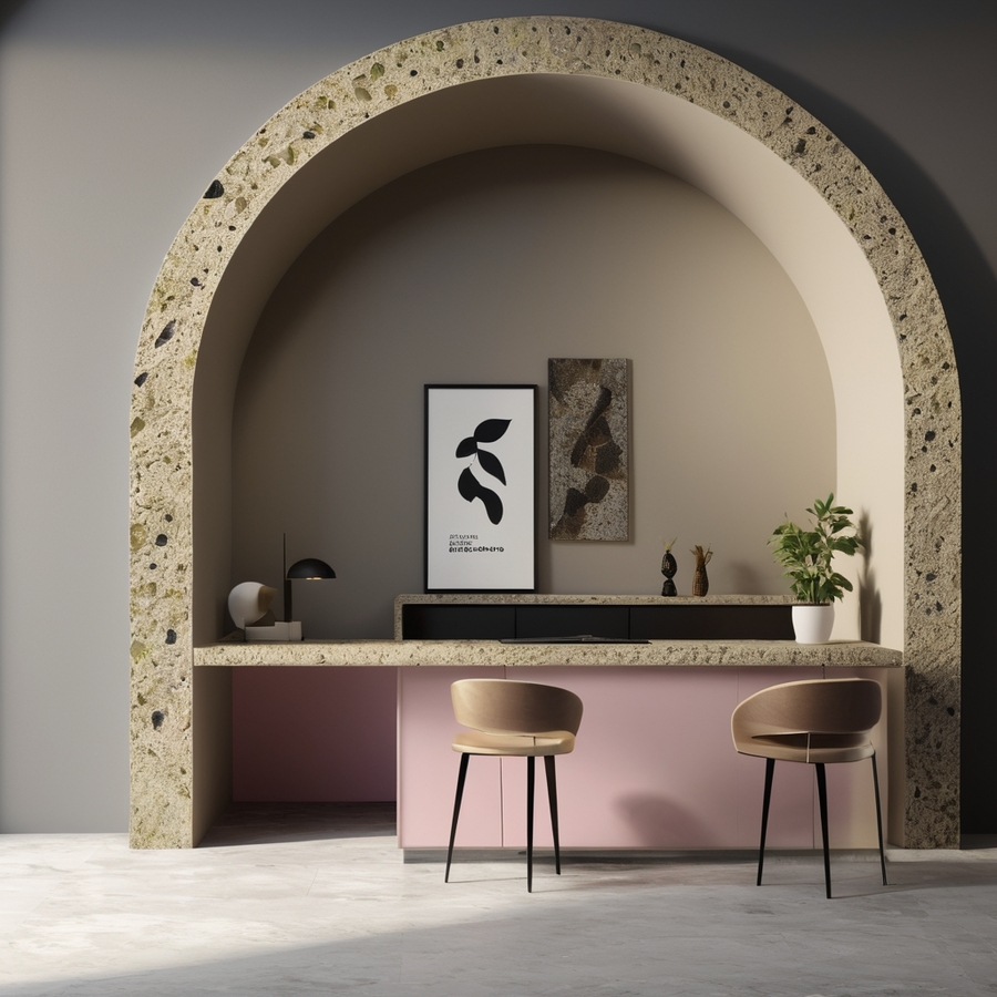 Референс и описание: Image showcases a modern interior design featuring a minimalist wall display. The style is contemporary with a focus on clean lines and geometric shapes. The layout includes a series of nine arched niches arranged in a 3×3 grid on a light beige wall, each niche having a smooth, matte finish. Below the niches, a large, dark brown terrazzo countertop with visible stone aggregates adds texture and contrast. The right side of the image features a large, arched doorway with a muted pink hue, complementing the overall color palette.