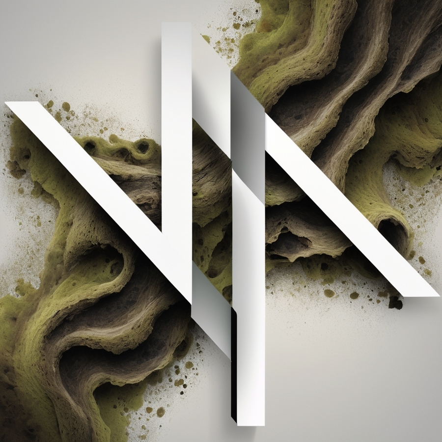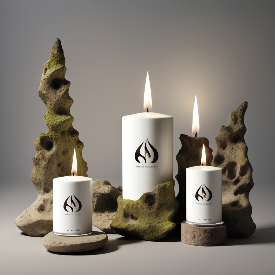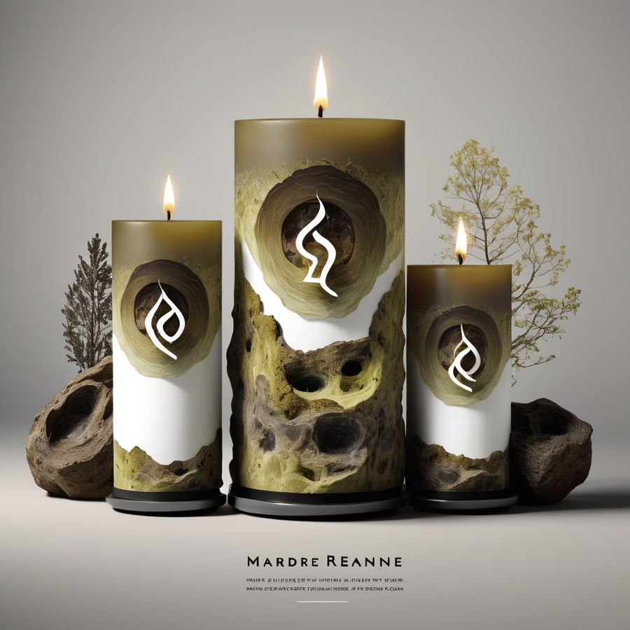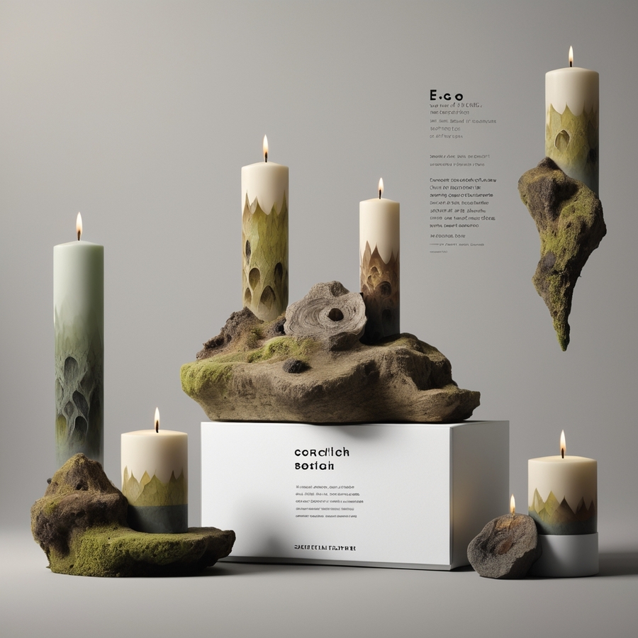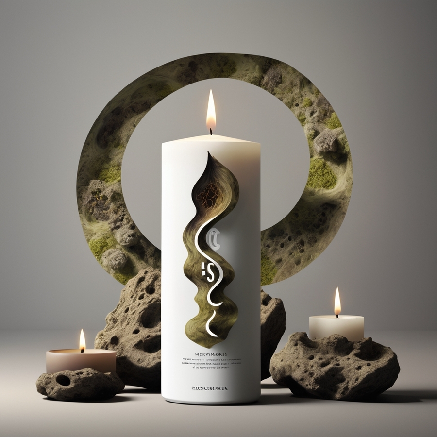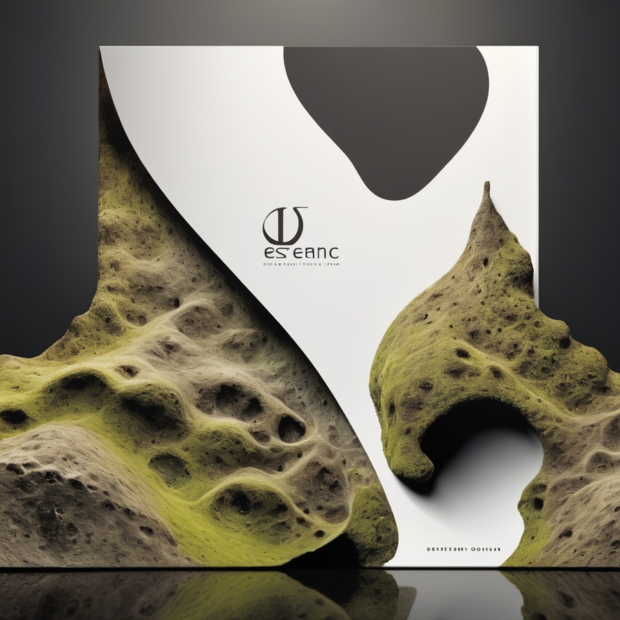 Референс и описание: Image is a modern, abstract art piece featuring a combination of organic and geometric elements, promoting a new line of eco-friendly candles. The layout is asymmetrical, with a prominent contrast between the smooth, white geometric shape on the right and the textured, mossy green and brown organic forms on the left, evoking the warmth and ambiance of a candlelit space. The organic forms resemble eroded rock or coral, with a porous surface and undulating curves. In the upper center, there is a stylized logo consisting of a circular emblem and the text 'es’eanc' in a sleek, modern font. Below the logo, smaller text reads ' Illuminate Your Connection with Nature' in a minimalist style, highlighting the eco-friendly aspects of the candles. The overall color palette is earthy, with muted greens and browns contrasting against the stark white background, creating a striking visual effect.