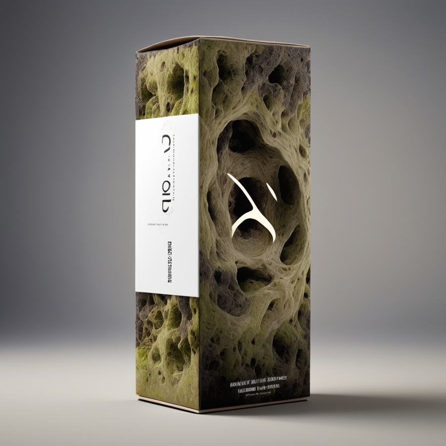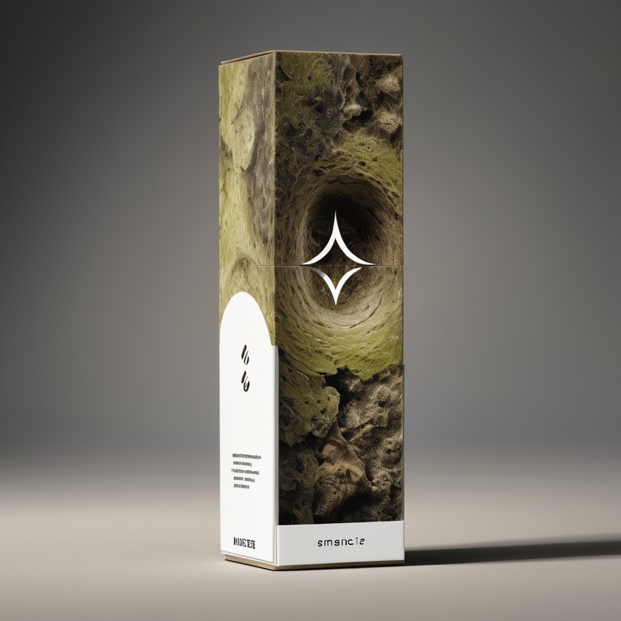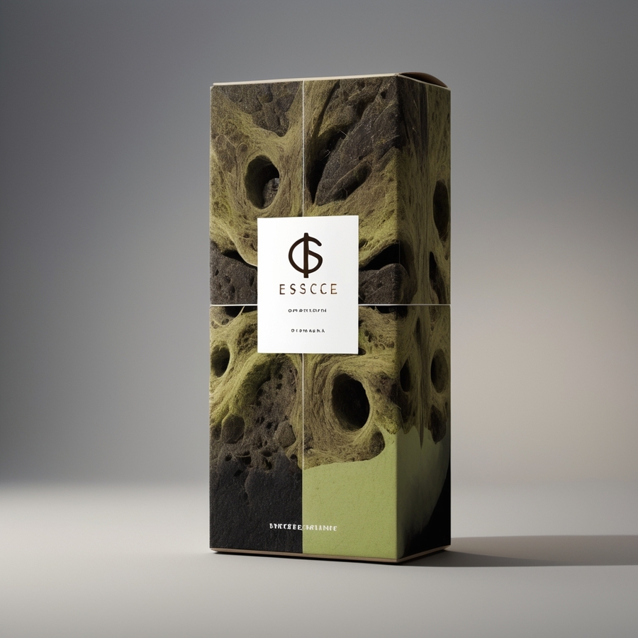 Референс и описание: Image is a digital artwork featuring a stylized, abstract design on a rectangular packaging box. The main body of the box has a textured, moss-like surface in shades of green and brown, creating an organic and earthy appearance. At the center, there is a symmetrical, white emblem resembling a stylized figure or symbol, which stands out against the darker background. The top flap of the box has a clean, white strip containing text. The word 'ESSENCE' is printed in a minimalist, sans-serif font on the left side, while '1.7L_02' is positioned on the right, both in black. The overall composition is modern and visually striking, with a strong contrast between the natural textures and the clean, geometric elements.