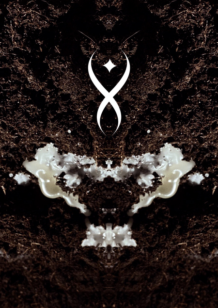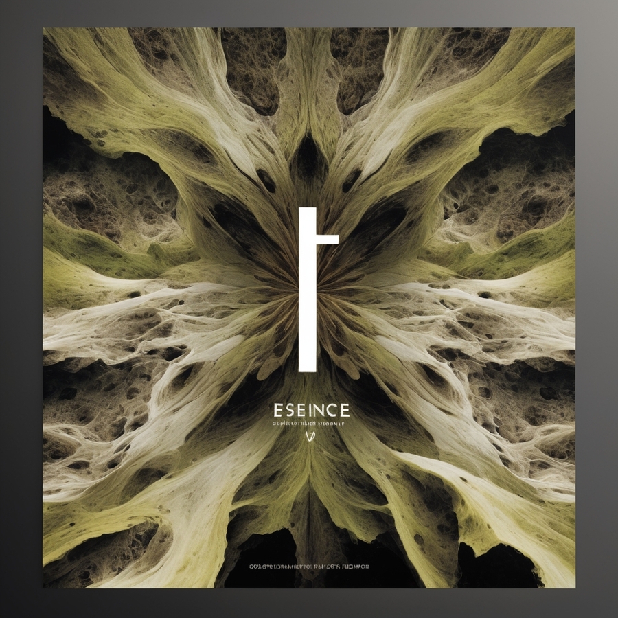 Референс и описание: Image is a digital artwork featuring a rectangular layout with a central focus on a stylized, abstract design. The background consists of a textured, moss-like surface in shades of green and brown, creating an organic and earthy appearance. At the center, there is a symmetrical, white emblem resembling a stylized figure or symbol, which stands out against the darker background. The bottom portion of the image is a clean, white strip containing text. The word 'ESSENCE' is printed in a minimalist, sans-serif font on the left side, while '1.7L_02' is positioned on the right, both in black. The overall composition is modern and visually striking, with a strong contrast between the natural textures and the clean, geometric elements.