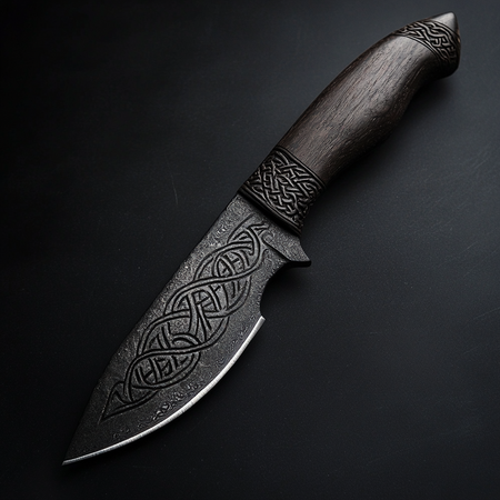 Нож в Midjourney: A dark, detailed, intricately carved knife head with Celtic knotwork design, lying diagonally on a black background, showcasing deep shadows and a smooth, polished surface. The dark wooden handle curves elegantly towards a sharp, pointed blade, rendered in high detail with rich, deep tones and textures. —v 6.1