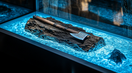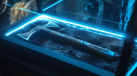 Midjourney: close-up of a modern Viking-themed shop display, showcasing a sleek glass case illuminated by a soft blue glow. Inside the case, a finely crafted axe with runic engravings lies alongside a Mjolnir pendant and a Valknut ring, all meticulously detailed and glowing faintly under the light. The edge of the display features a rustic touch: a small section of a wooden log, polished smooth, subtly incorporated into the design. The background hints at aged wooden textures and fur-draped accents, with a faint blue glow from nearby lighting creating a mystical, Nordic atmosphere, --ar 16:9 --v 6.1