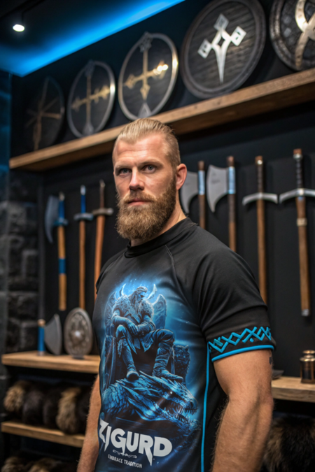 Midjourney: brutal and confident shop consultant with a rugged, Viking-inspired look, wearing a sleek, modern black shirt with subtle branding and a bold blue line on the sleeve ends and collar. He stands in a high-tech, atmospheric store with black and blue tones, wood and fur textures incorporated into the decor. The glowing shelves prominently display Norse weapons like axes, swords, and shields, with fewer additional items, creating a sharp focus on the Viking aesthetic. Dramatic lighting emphasizes the consultant’s intense expression and muscular build, enhancing the bold and striking composition. --v 6.1 --ar 3:2