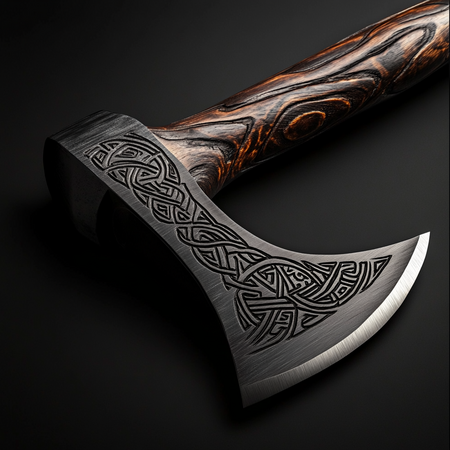 Топор в Midjourney: A dark, detailed, intricately carved nordic steal Axe with Celtic knotwork design, lying diagonally on a black background, showcasing deep shadows and a smooth, polished surface. The dark wooden handle curves elegantly towards a sharp, pointed blade, rendered in high detail with rich, deep tones and textures, photorealistic —v 6.1