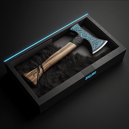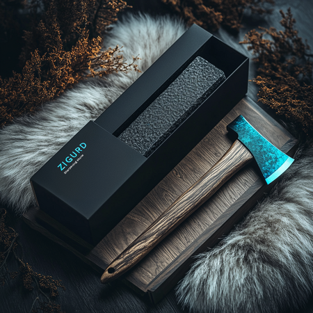 Упаковка в Midjourney: modern and striking packaging design for an axe, blending rugged Viking aesthetics with sleek modernity. A matte black exterior with a wooden panel inset on the top, Nordic runes and glowing faint blue accents along the edges. The axe head is nestled securely within a black foam insert and the wooden handle is cradled by a fur-textured lining. Sans-serif white text reading 'ZIGURD' is on the side of box. --v 6.1
