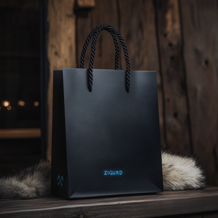 Пакет в Midjourney: sleek and modern shopping bag design for the Viking-inspired shop, crafted from matte black material with natural wood texture accents. The front features shop’s branding 'ZIGURD' in clean white text. The handles are thick and black. Minimalistic blue accents. --v 6.1