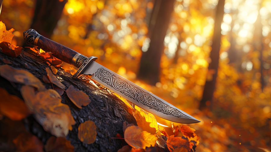 Нож в Midjourney: A detailed, slightly low-angle close-up of a gleaming Nordic rune-ornate knife resting on a weathered, golden-brown log in a serene, autumn forest scene; the interplay of textures, straight handle, fallen leaves, and warm, earthy tones creates an evocative, crisp atmosphere. The photorealistic composition features an out-of-focus background with soft sunlight filtering through the vibrant orange and yellow foliage. —ar 16:9 —v 6.1