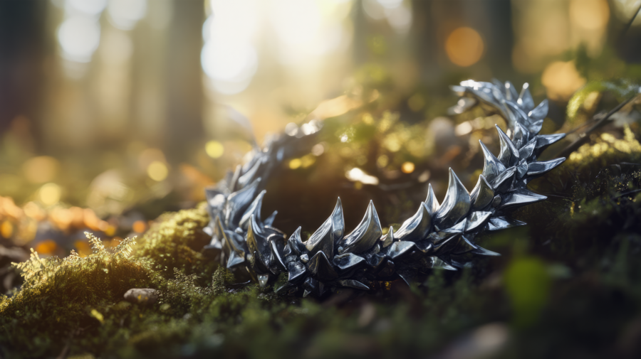 Цепь в Midjourney: A detailed close-up of a silver-toned, scale-like dragon necklace or collar, resting on a bed of mossy forest floor, with out-of-focus blurry trees and sunlight filtering through; showing a shallow depth of field, emphasizing textures of the moss, wood, and metal collar, with warm but muted forest tones. —ar 16:9 —v 6.1