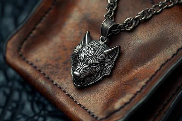 Сумка в Midjourney: close-up of silver-colored Viking-style necklace with a norse mythology Fenrir head pendant, resting in brown leather pouch, featuring intricate details, textured chain. The pouch leather has distressed, aged look, and the wolf pendant and chain —ar 3:2 —v 6.1