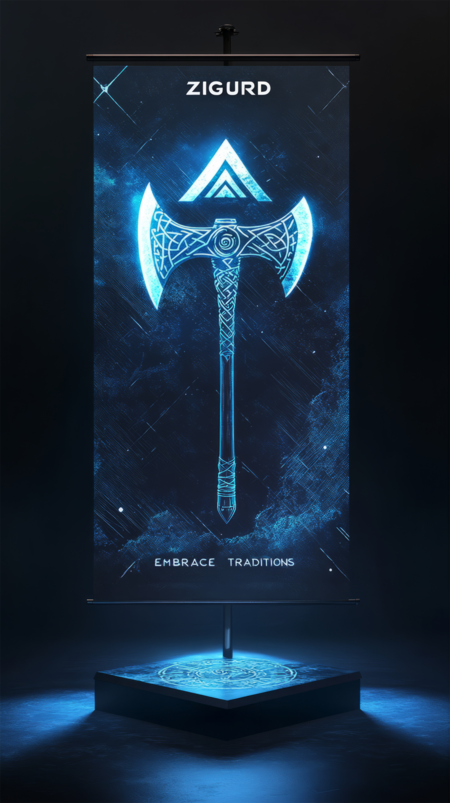 Баннер в Midjourney: A sleek, modern outdoor banner designed for a Viking-themed shop, featuring, glowing blue 'ZIGURD' logo in clean, sans-serif white text at the top. The background is a dark gradient with subtle Nordic rune patterns, illuminated by faint blue light. The centerpiece is a striking image of a rune-engraved axe resting on a polished display, blue glow effects emphasize its craftsmanship. Below, minimalist white text reads 'EMBRACE TRADITION, ' accompanied by a QR code and shop details in clean fonts. The overall design is modern and professional with to the shop’s Nordic-inspired aesthetic. --v 6.1 --ar 9:16