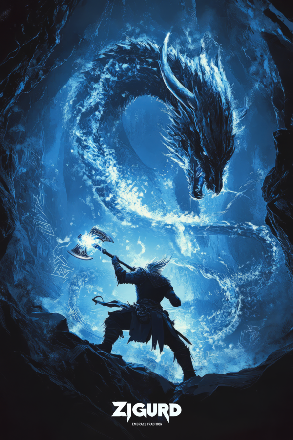 Плакат в Midjourney: A dynamic, stylized poster featuring Zigurd, a Viking-like figure, mid-battle against a massive dragon inside a shadowy cave. Zigurd wields a glowing, rune-etched axe, its blue light reflecting off the jagged cave walls, casting intricate patterns of runes and energy. The dragon coils around the cave, its fiery eyes piercing the darkness, and its shimmering scales faintly catching the blue glow. The cave walls are illuminated with a mystical blue aura, enhanced by glowing runes. --ar 2:3 --v 6.1