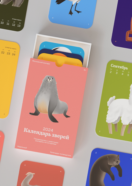 Календарь посвящен 160-летию со дня открытия Московского зоопарка. На каждой неделе будущего года мы встречаем животное, а на обороте карточки краткую информацию о нем. У некоторых из животных есть имена и личные истории, которые также можно прочесть на обороте. Порядок животных в календаре обусловлен порядком вольеров в зоопарке при маршруте, охватывающем старую и новую территории.