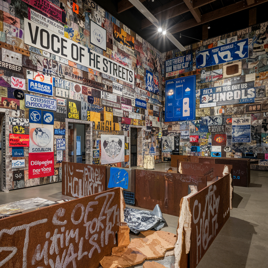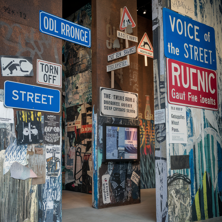 Promt for Ideogram: A photo of the interior of the exhibition «Voice of the Streets». The walls are covered with a collage of street signs, tags, posters, and advertisements.
