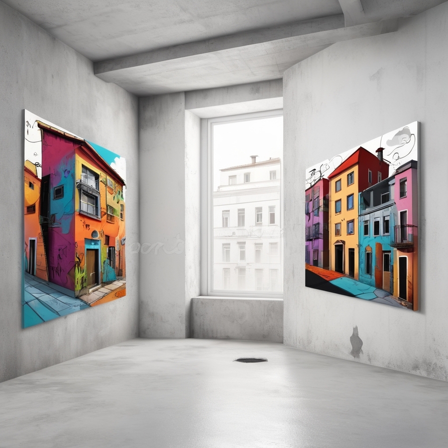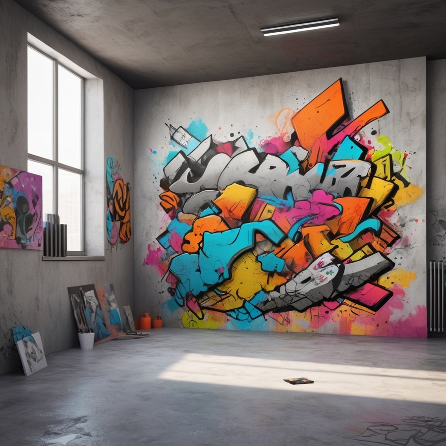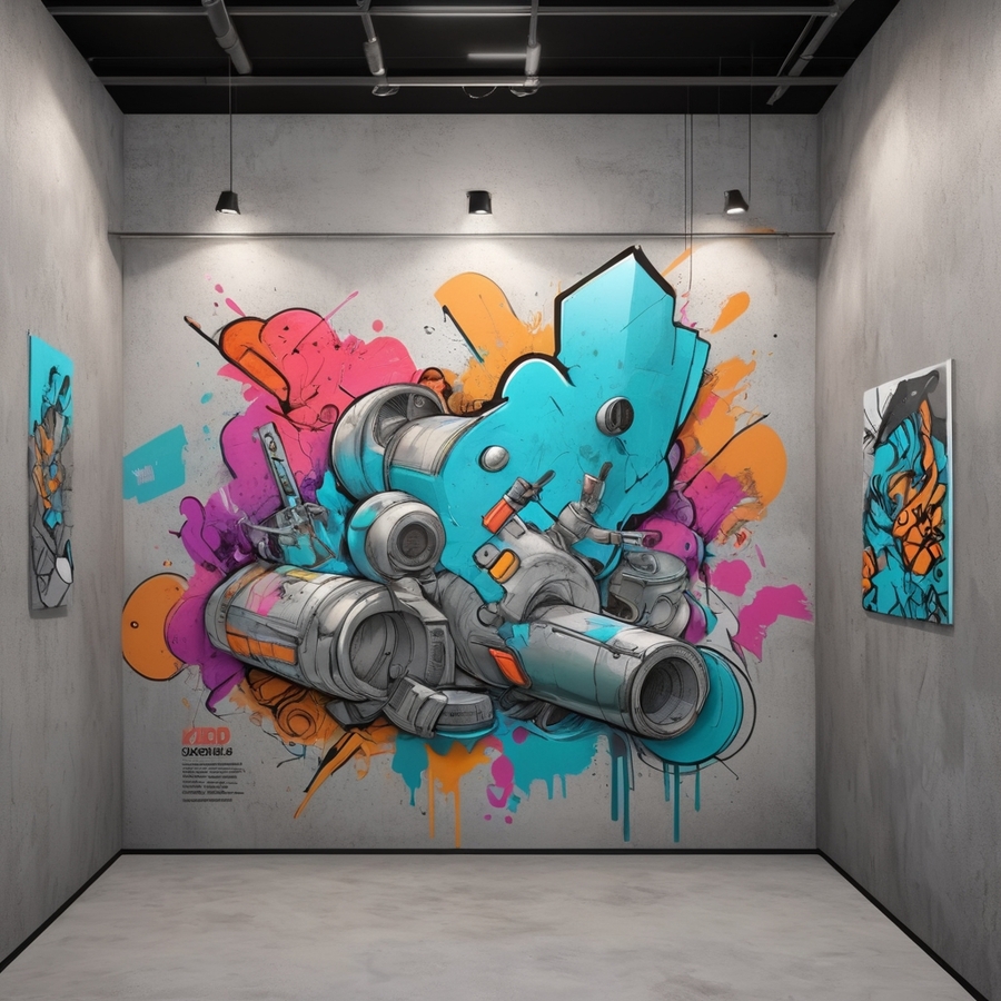 Promt for Leonardo AI: Generate the interior of the exhibition «Concrete and Paint» Reproductions of works by street artists: sketches and digital mock-ups of projects.