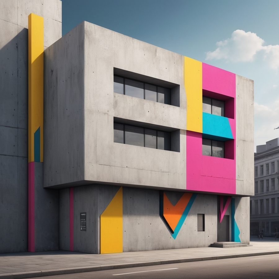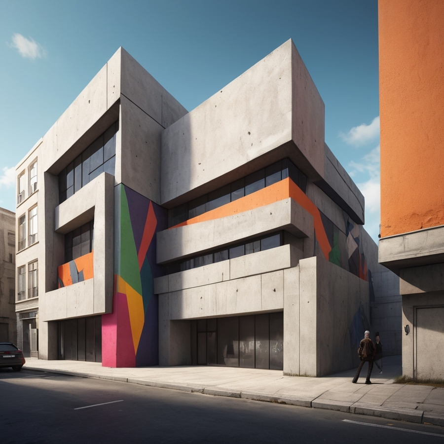 Promt for Leonardo AI: Сreate a museum building for the street art exhibition which called «Voice of the Streets» of rectangular simple shapes, concrete texture with bright accents and a brutal, grotesque font use logo from link: https://ideogram.ai/assets/image/lossless/response/9yHTCnlRSx6upHpe55n4zA and add a sign in the same style to the façade.