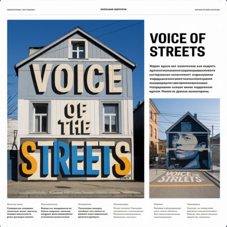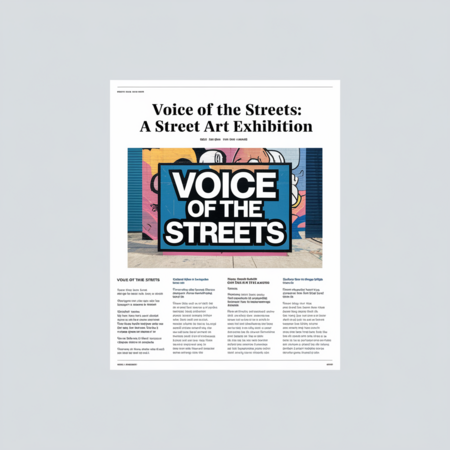 Prompt for Ideogram: A magazine article with a headline «Voice of the Streets: A Street Art Exhibition». Below the headline, there’s a photo of a street art piece with the text «Voice of the Streets». The article text is in a clean, modern font. The background is light gray.