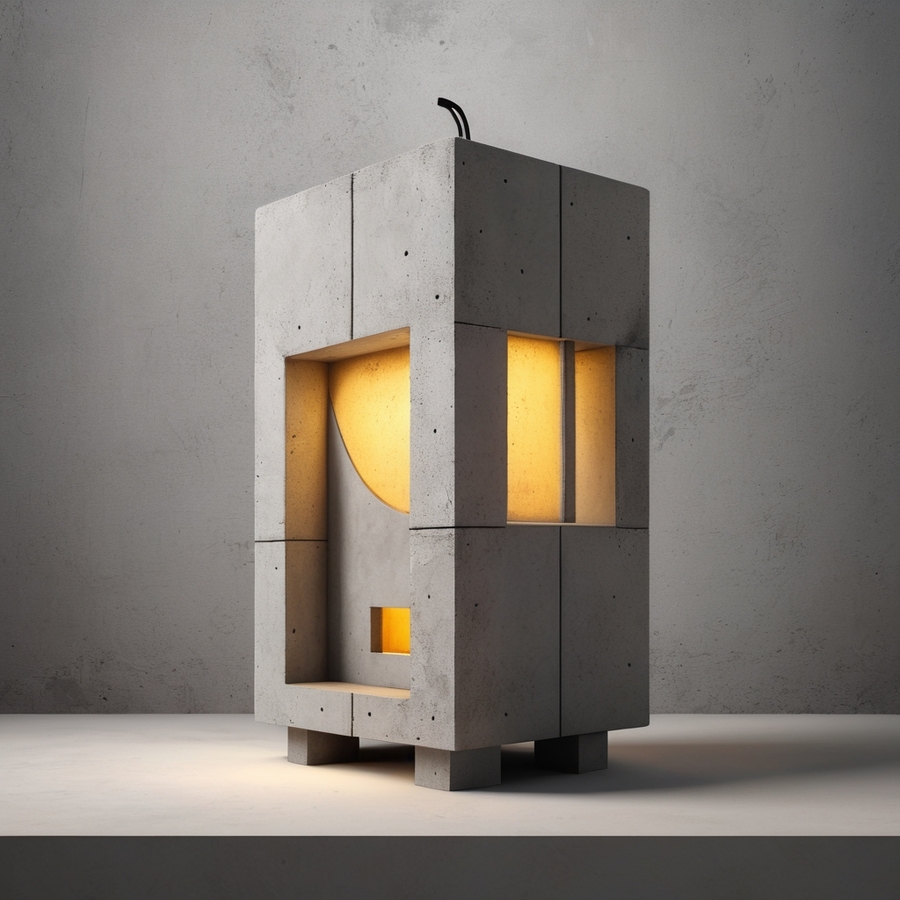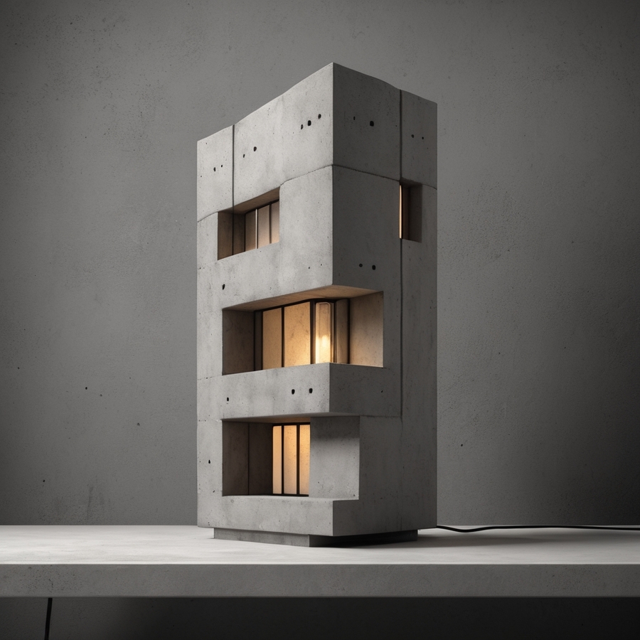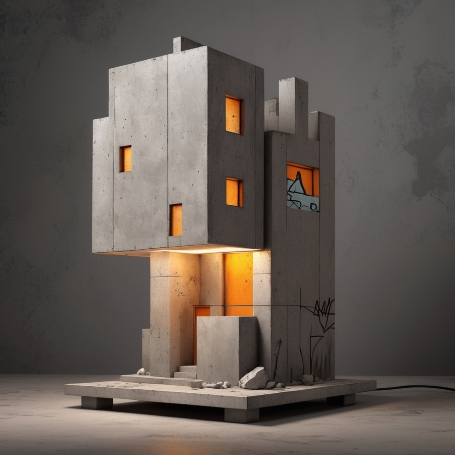 Светильники ввиде бетонных зданий, отсылающих к основному настроению проекта