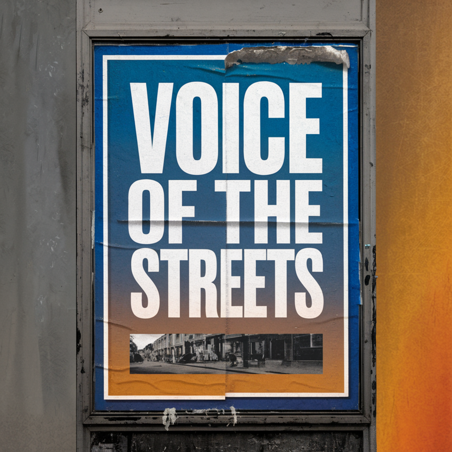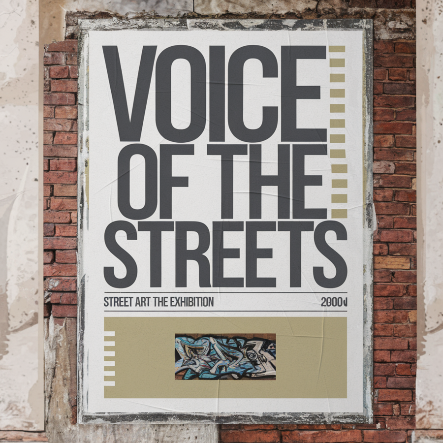 Prompt for Ideogram: A minimalistic mockup of a poster on the street for a street art exhibition called «Voice of the Streets». The poster has a bold, uppercase title and the name of the exhibition. Below the title, there is a small image of a street art piece.