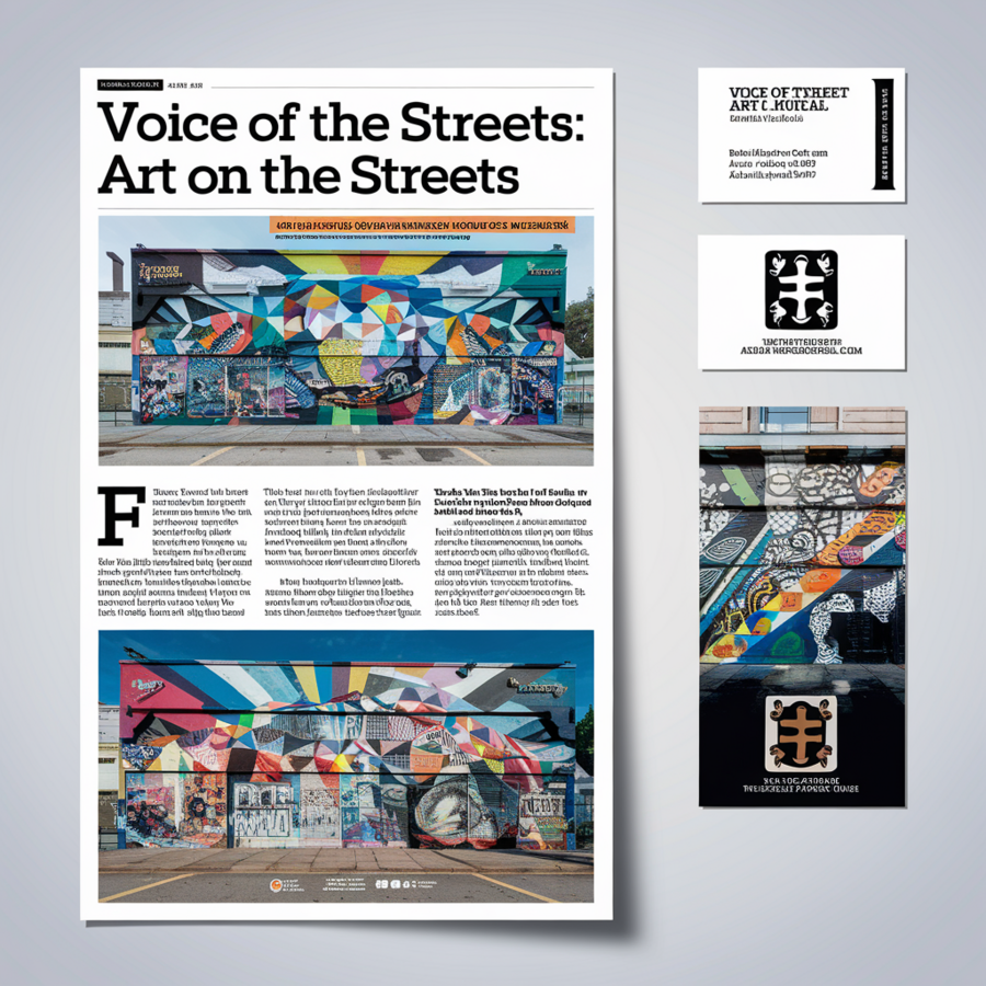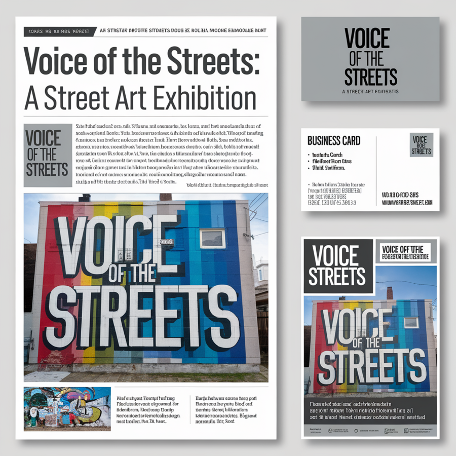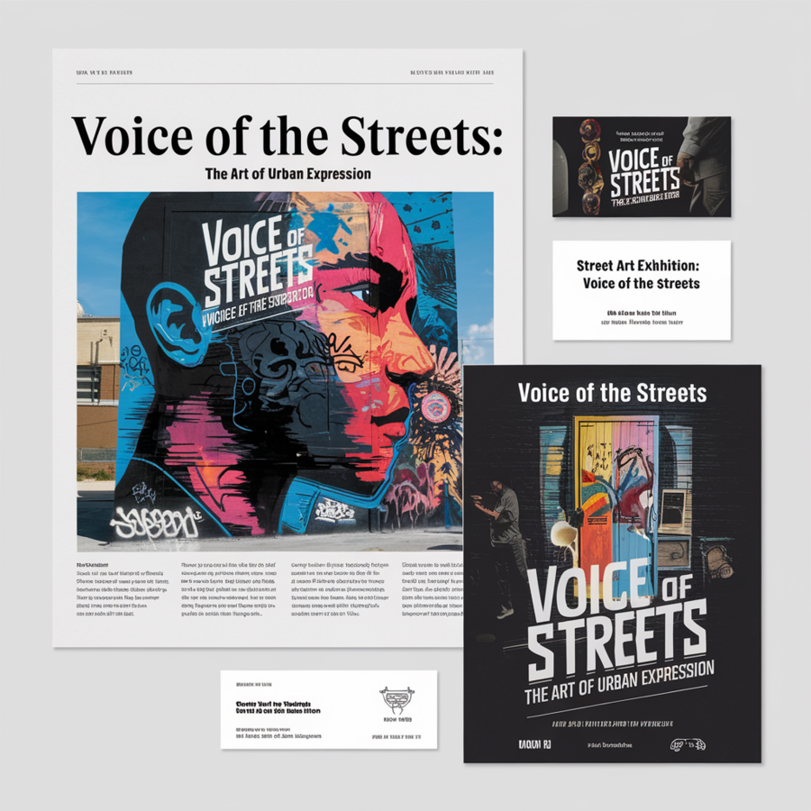 Prompt for Ideogram: Usе https://ideogram.ai/assets/image/lossless/response/9yHTCnlRSx6upHpe55n4zA make on mockups of business cards, magazines, catalogs for the street art exhibition use bold grotesk font Develop a piece of stationery for the previous request: an article in a magazine, a business card, an advertising brochure, a poster.