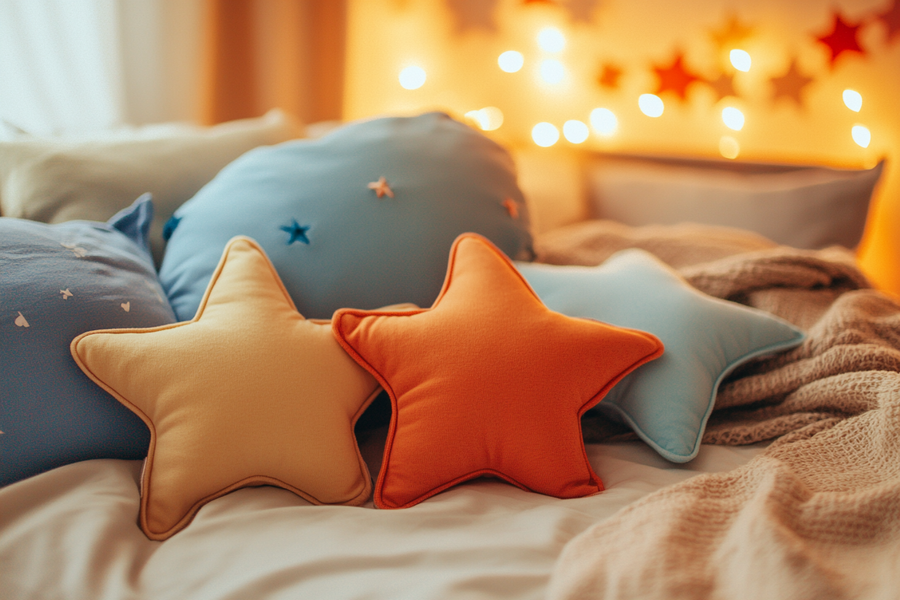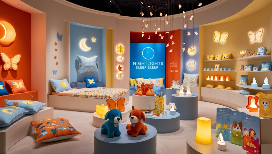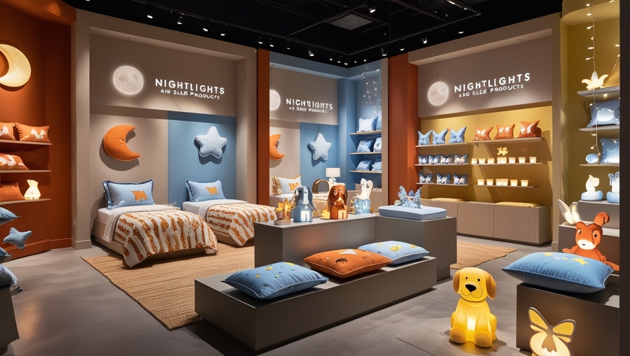 A shop for a children’s brand specializing in nightlights and sleep products. The space should feel cozy, with warm yet slightly dimmed lighting to create a magical atmosphere. The walls and floor have neutral tones that contrast with the brand’s product colors—orange-red, blue, light blue, and yellow. Products displayed around the store include pillows shaped like moons, butterflies, and stars; bedding; string lights; and nightlights in the shapes of animals, fairies, and butterflies.