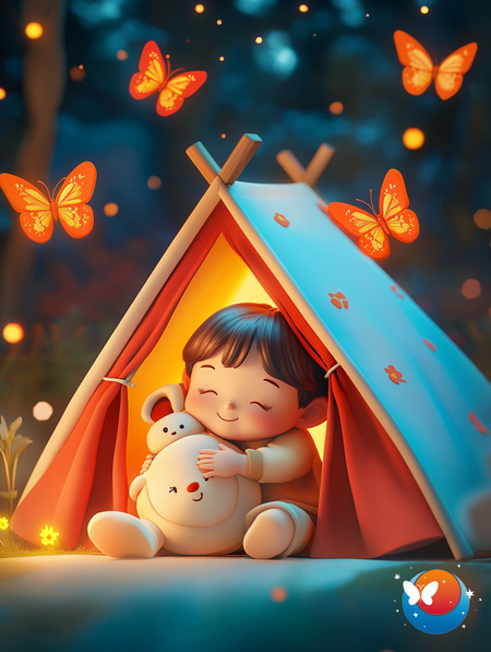 A minimalistic and stylized logo of a children’s brand of nightlights and sleep products, reflecting a magical atmosphere. The name of the brand is «MOON FAIRY». The logo should use three primary colors: blue, orange-red, and white, with subtle gradients that give a soft, glowing effect, reminiscent of a nightlight. The logo should have a butterfly.