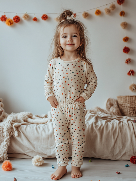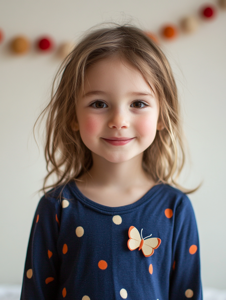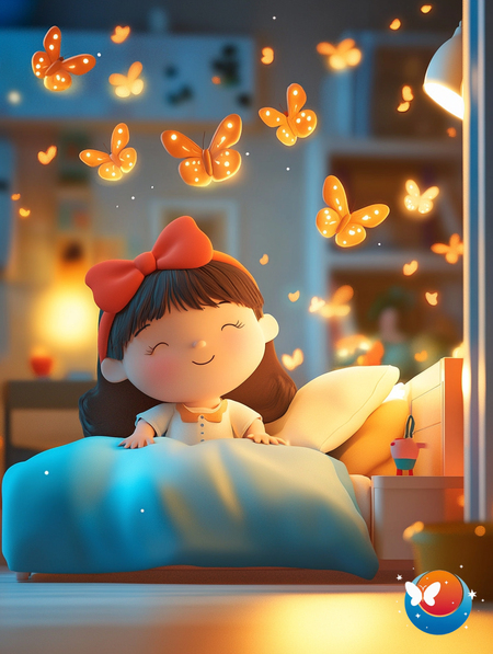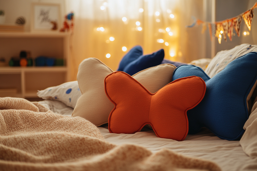 Realistic vibrant and lively photo of a cozy and cute warm bedding blanket with a simple minimalistic butterfly pattern in orange-red, blue and beige colors. The blanket is lying on the bed, with a slightly dimmed warm light in the child’s room.