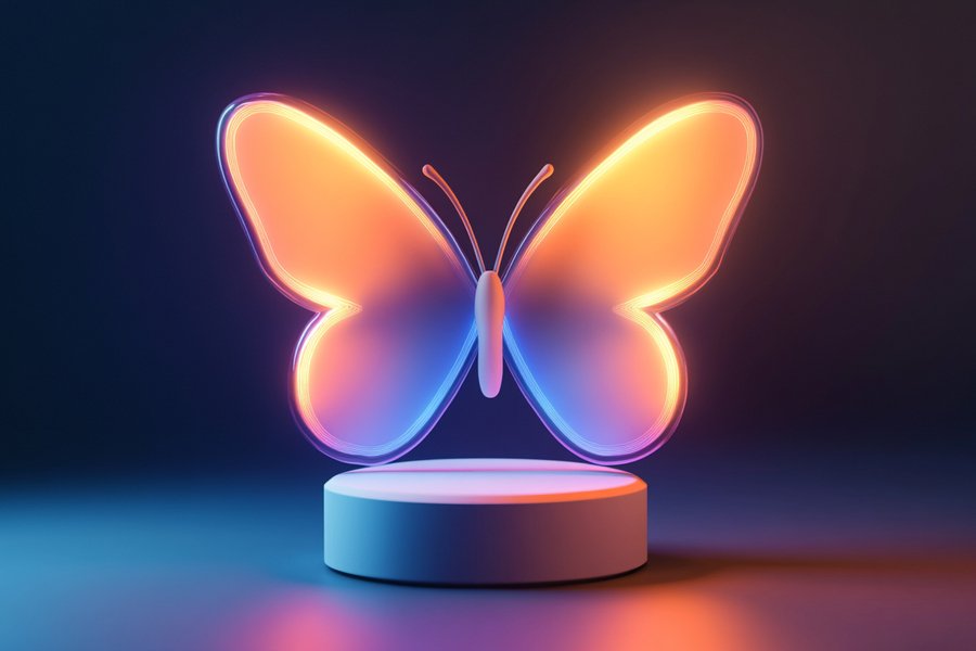 промпт для Midjourney: 3D render of a night light in the shape of a minimalistic and cute magical butterfly using red-orange, blue and white on a small white stand on a neutral background.