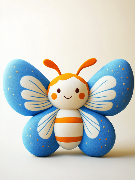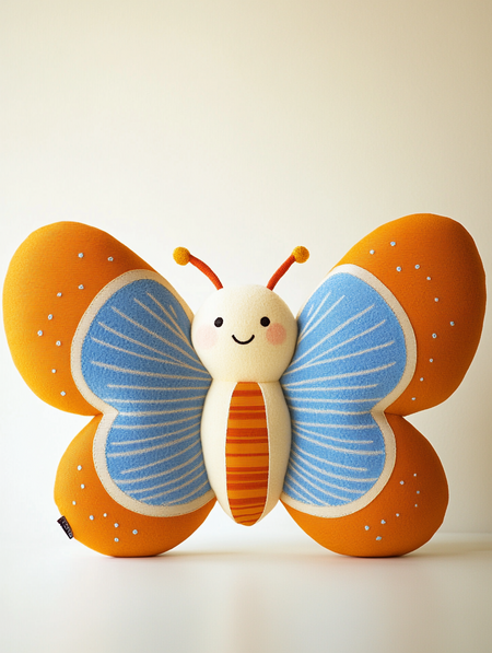 A cute and simple plush toy in the shape of a butterfly using blue, orange and beige colors. The butterfly should have a smiling face, with soft, rounded wings that are slightly oversized for a whimsical effect. The wings can be patterned with stripes or polka dot to add visual interest. The plush toy should be made from soft, high-quality fabric, making it huggable and perfect for children.