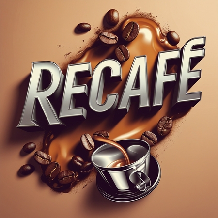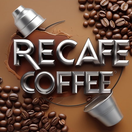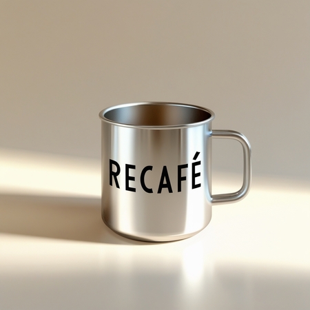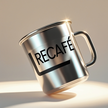 Кружки — Ярко освещенная, изолированная алюминиевая кофейная кружка с глянцевым покрытием, если смотреть на нее под углом 45 градусов, с яркой современной надписью «ReCafe» жирным шрифтом Noah Head, четкими линиями, закругленными краями и прочной ручкой на мягком кремово-белом фоне, который тонко подчеркивает металлическая текстура кружки с едва заметной тенью под ней создает ощущение тепла и уюта.