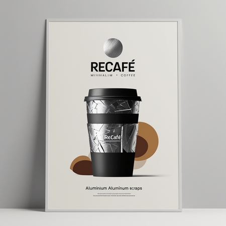 Постеры — Лаконичный современный минималистский плакат для ReCafe, представляющий собой гармоничное сочетание алюминия и кофейных элементов, с преимущественно нейтральной цветовой палитрой, подчеркнутой насыщенными, землистыми тонами, создающими ощущение изысканности и экологичности, на чистом белом или светло-сером фоне, с ярким шрифтом без засечек. выделяющийся логотип ReCafe в серебристом металлизированном или алюминиевом исполнении, расположенный на видном месте в верхней части плаката, и стилизованная упрощенная иллюстрация кофейной чашки или кофейных зерен, изготовленных из обрезков алюминия, тонко сочетаются с текстом, передавая экологичный подход бренда к устойчивому развитию. поддерживайте визуальный баланс и сосредоточьтесь на центральной теме.