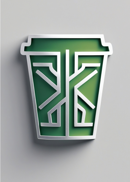 Стаканчик изображен в виде контурного силуэта, выполненного в зеленом цвете. Четыре линии располагаются внутри стаканчика, создавая пересечение в нижней части, где сходятся трубы. Линии выполнены в матовом серебряном цвете. Линии образуют геометрический узор, отражающий устойчивую и экологичную миссию компании.