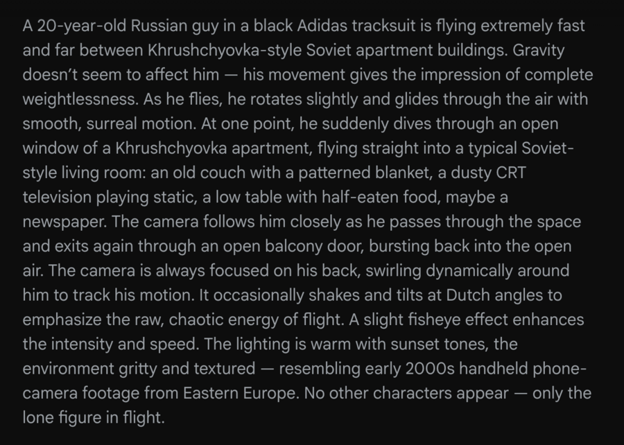 Это история о человеке, оказавшемся в непростой, ограниченной жизненной реальности — в мире насилия, серых дворов и бытовой усталости. Но он не впадает в отчаяние. Вместо этого он летит. Полёт здесь выступает символом внутреннего потенциала, который не определяется местом рождения, социальной средой или обстоятельствами.