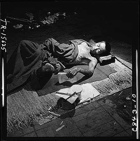 Пострадавшие от бомбардировки женщина и ее ребенок лежат на одеяле в поврежденном здании банка, превращенном в госпиталь. 6 октября 1945 года. Фото AP Photo/ ТАСС