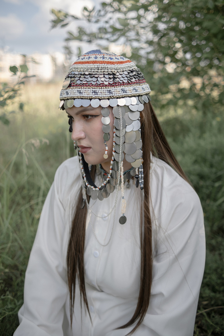 Чувашская художница Татьяна Андреева в изготовленном ею национальном головном уборе — тухье, национальном девечьем головном уборе. Новочебоксарск, Чувашская Республика, Россия.