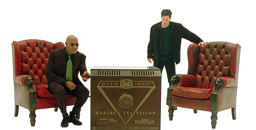 Скриншот из Garry’s Mod (2006) и кадр из The Matrix (1999). Белая комната, только двери видны — напоминает Матрицу, тоже по своей сути лиминальное пространство.