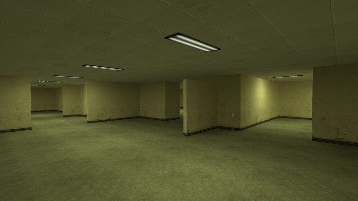 Скриншоты из Garry’s Mod (2006). На последнем изображении — Backrooms. Желтоватые стены gm_construct напоминают желые Закулисья.